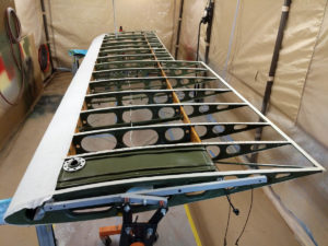 Just finished pulling the fabric envelope around the wing and gluing the ends and the aileron cove. picture below is the top of the right wing before starting to shrink the fabric.